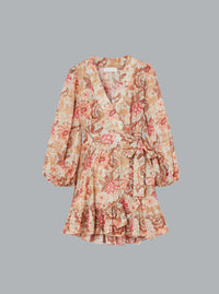 Etherisch en romantisch zijn slechts woorden die een Zimmermann-creatie nauwelijks kunnen beschrijven. Deze Daylight wikkeljurk is gemaakt van katoen in een mini-lengte, met een opvallende bloemenprint en ruches langs de rok.