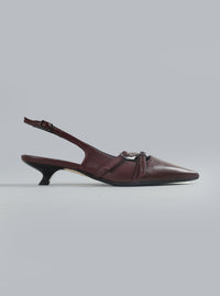De ROTUE Bumb Love Kitten Heels, uitgevoerd in auberginekleurig leer, hebben een verfijnde uitstraling. Deze sculpturale slingback heeft een elegant spitse neus en een subtiel knoopdetail op de wreef. Een smal bandje sluit met een donkergrijze metalen gesp en zorgt voor een perfecte pasvorm. De elegante kittenhak van 4 cm tilt elke outfit naar een hoger niveau, waardoor deze schoen ideaal is voor zowel chique dagkleding als stijlvolle avondgelegenheden.