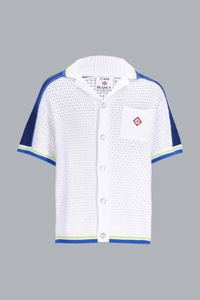 Het gehaakte overhemd is een verfijnd ontwerp, vervaardigd met een open weefstructuur en voorzien van strepen op de schouders en mouwen. Het is afgewerkt met een Cubaanse kraag, knoopsluiting, de kenmerkende parelknopen met gouden rand van het huis, geribde manchetten, zoom en kraag met gestreepte rand, en een borstzak.