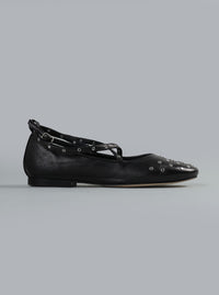 Artikelnaam: Lucid Dreams Black: Een met studs versierde leren ballerina met enkelbandje.De ROTUE Lucid Dreams Black ballerina's geven een klassieke vorm een eigenzinnige twist. Uitgevoerd in zacht leer, is het ontwerp voorzien van nauwkeurig geplaatste metalen studs op de ronde neus en langs de verfijnde kruisende bandjes. Een gepolijste gesp sluit het delicate enkelbandje en zorgt voor een perfecte pasvorm. Dit item straalt moderne elegantie uit en is even geschikt voor een chique stadslook als voor een stijlvolle avondoutfit. De afwerking getuigt van nauwgezette aandacht voor detail.