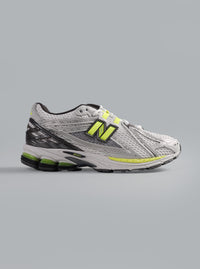 Deze sculpturale sneaker maakt gebruik van een technische mesh-basis, verstevigd met nauwkeurig gesneden synthetische overlays in metallic zilver. Het ontwerp kenmerkt zich door scherpe contrastaccenten van opvallend neongeel, die het 'N'-logo aan de zijkant en het speciale N-ERGY hieldempingssysteem accentueren. Het silhouet, geïnspireerd op hardloopschoenen uit de tijd rond de eeuwwisseling, straalt een dynamische, stedelijke chic uit. De robuuste constructie zorgt voor een zelfverzekerde uitstraling, waardoor het een opvallend item is voor de moderne garderobe.