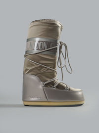 The ICON GLANCE HIGH PLATINUM boot presents a sculptural form, meticulously constructed from a metallic-finish synthetic material at the base, seamlessly transitioning into a padded, water-resistant textile shaft. Criss-cross lacing secures the design, highlighting a transparent band bearing the "MOON BOOT" wordmark on the upper shaft and additional "MOON BOOT" branding on the quarter panel. This iconic silhouette defines modern luxury, a distinctive piece for sophisticated cold-weather settings.