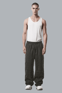 Thom Krom's woven wide-leg trousers deliver understated sophistication through meticulous construction. Crafted from 100% linen, these trousers feature a relaxed silhouette with an elastic waistband and drawstring for adjustable comfort. Functional details include double welt pockets and a patched back pocket, plus a concealed safety pocket for secure storage. Made in Portugal, this piece exemplifies the brand's commitment to quality craftsmanship and timeless design.